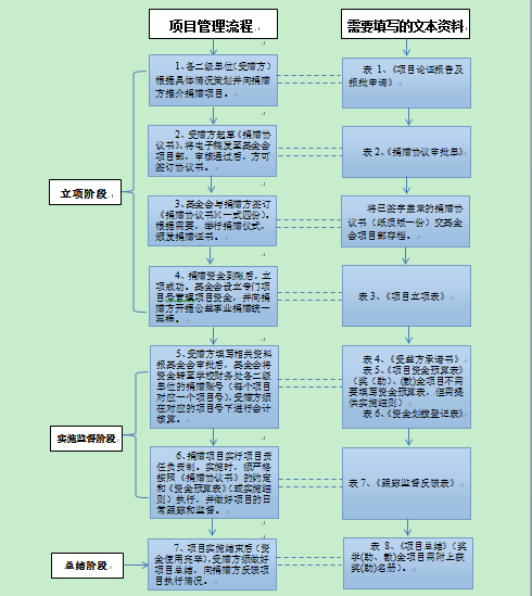 1、“项目管理流程”与“需要填写的表格”为一一对应关系,请按照捐赠流程填写相应表格。